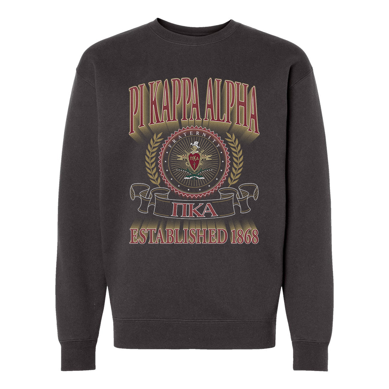 Make a bold statement with the Pike Heavyweight Graphic Crewneck, inspired by classic large-print athletic apparel. Crafted from a durable 10 oz cotton-poly blend, this sweatshirt delivers a true heavyweight feel that is thick, warm, and built to last. The front features bold Pi Kappa Alpha lettering tied into a vintage collegiate design that stands out. With its sturdy construction and soft interior, this crewneck is perfect for showcasing fraternity pride in comfort and style.