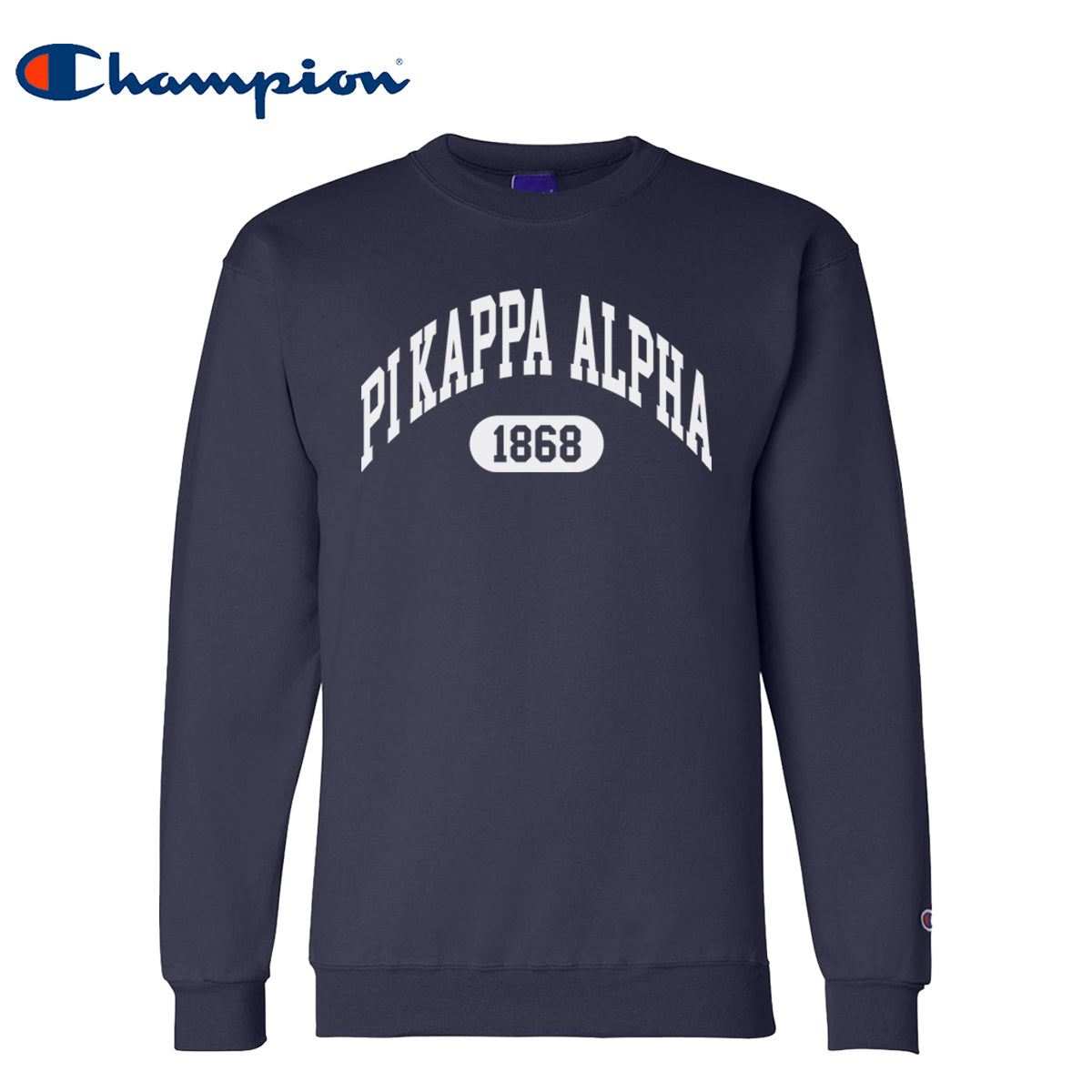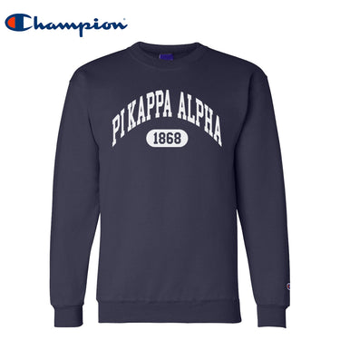 Rep your fraternity in timeless style with the PIKE Champion Collegiate Crewneck. Choose between gray and navy in this officially licensed sweatshirt featuring the Pi Kappa Alpha name arched across the chest with the founding year proudly displayed underneath. Whether you're heading to class, lounging at the house, or showing out on game day, this sweatshirt has your back in comfort and style.